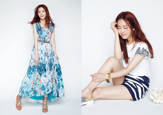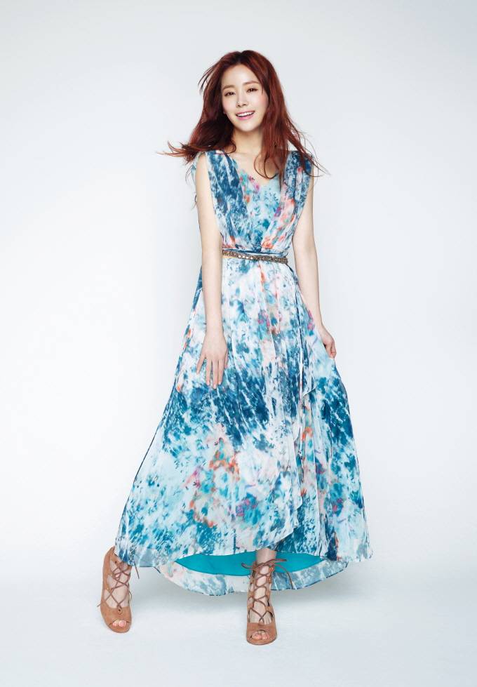 한지민의 미소처럼 시원한 아나카프리」의 선 드레스는 이국적인 트로피컬 패턴과 블루 컬러의 조화가 매력적인 맥시 드레스로, 적당히 루즈한 핏과 발목까지 오는 길이가 우아하면서도 다리를 길어 보이게 하는 효과가 있다.