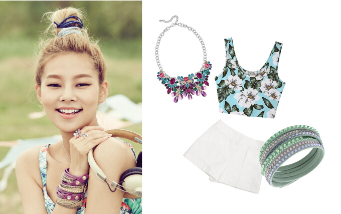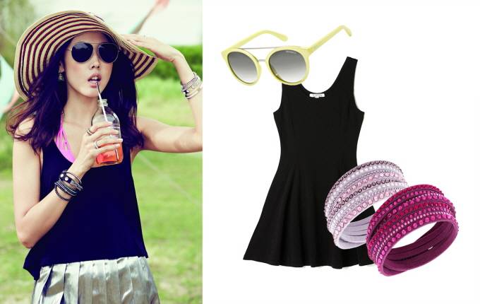 뷔스티에나 민소매 티셔츠에 드러나는 팔목을 강조할 수 있는 컬러 브레이슬릿은 매치해 세련된 락시크 룩을 완성해보자.