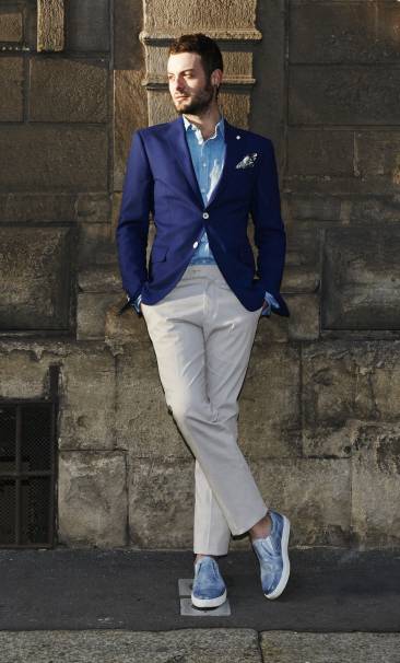 이탈리아 스트리트 패션 속 남자는 블루 셔츠와 베이지 팬츠를 매치하고 화이트 컬러의 단추가 포인트로 가미된 블루 자켓으로 여름 분위기를 한껏 살린 쿨비즈룩을 완성했다. 이때 그가 보여준 쿨비즈룩처럼 노타이로 자연스럽게 단추를 풀어주는 것이 요령이다.