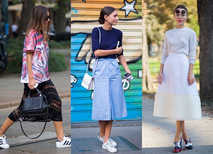 숄더 블라우스를 매치해 캐주얼하면서 발랄한 룩을 선보였다. 또 ‘슈퍼콤마비’ 2015 F/W 컬렉션에 참석한 모델 이현이는 셔츠와 맨투맨과 메탈릭 소재의 H라인 스커트, 스니커즈를 매치해 트렌디하고 캐주얼하면서도 유니크한 스트리트 감성의 미디 스커트 패션을 선보였다.