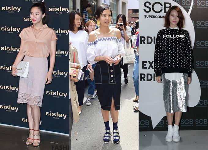 반면 지난 4월 영화 ‘화장’의 VIP 시사회에서 만난 조윤희는 강렬한 패턴의 레드 블라우스와 무릎을 덮는 블랙 스커트, 레드 힐을 매치해 세련되면서도 시크한 룩을 선보였으며, 디자이너 강기옥의 ‘KIOK’ 2015 F/W 컬렉션에 참석한 홍수아는 빈티지한 헤짐이 돋보이는 화이트 디스트로이드 재킷과 기하학적 패턴의 펜슬 스커트를 믹스매치해 트렌디한 룩을 선보였다. 그녀들이 선택한 H라인의 미디 스커트는 당당하고 섹시한 이미지로 오피스 룩이나 하객 패션으로 활용하기 좋다.