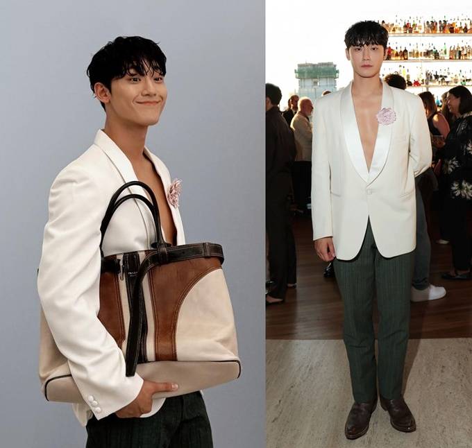 트와이스(TWICE) 사나, 엑소 카이와 함께 한국 대표로 프라다 패션쇼에 참석한 이도현은 이날 화이트 새틴 숄 라펠 재킷과 핀 스트라이프 팬츠를 매치한 턱시도 수트핏으로 존재감을 발산했다.
