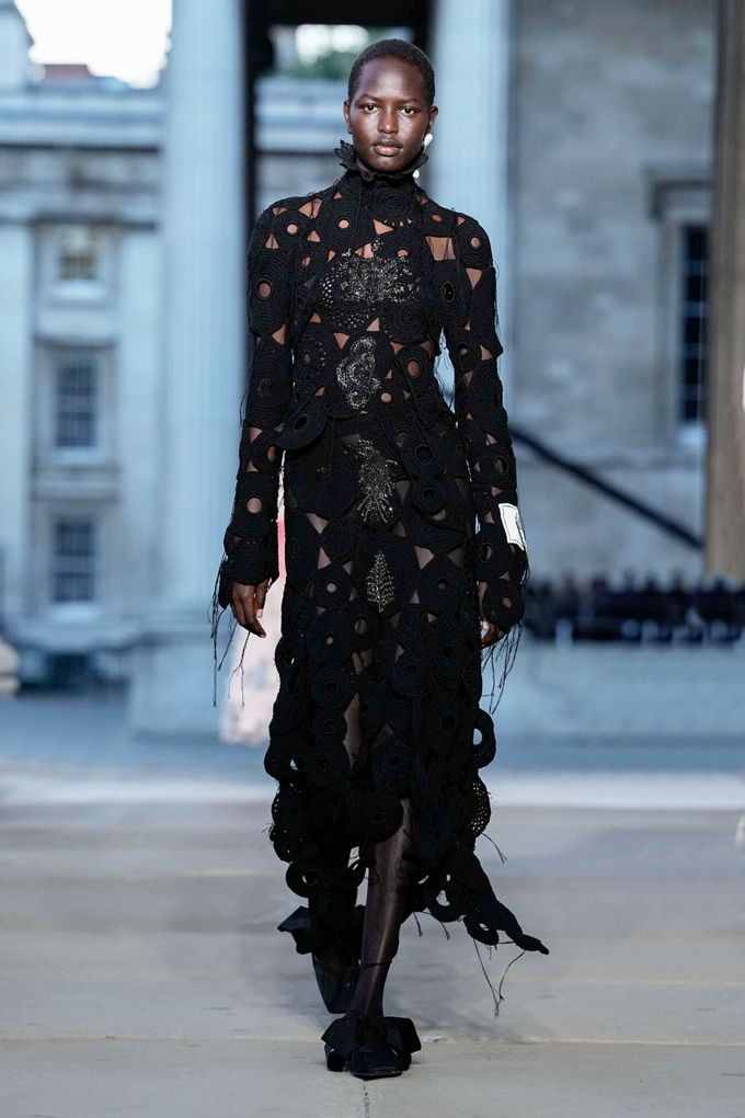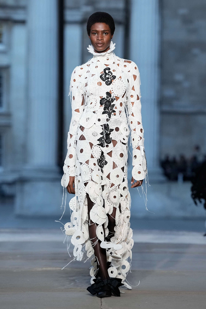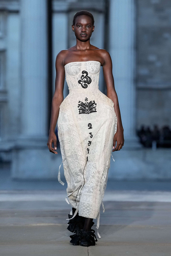 쇼는 콜라주 기법으로 제작된 앤틱 레이스 자투리와 제트 크리스털 문양 장식의 모래시계 미니 드레스로 시작되었으며, 아이보리색 메탈릭 코튼 소재의 양면 트렌치코트는 꽃무늬 자수 안감과 레이스 콜라주 디테일이 돋보였다.