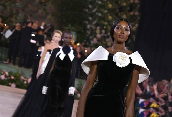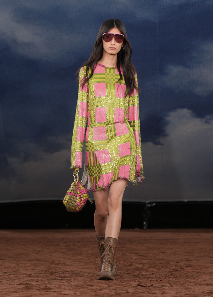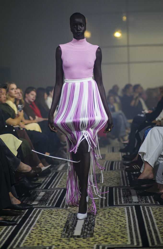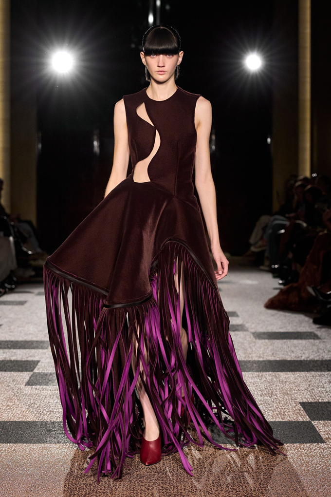 에델라인 리는 프린지 장식을 실험하며, 평소 가장자리가 있는 밑단을 포기하고, 걸을 때마다 액체처럼 움직이는 머리부터 발끝까지 프린지 장식을 선택했다.