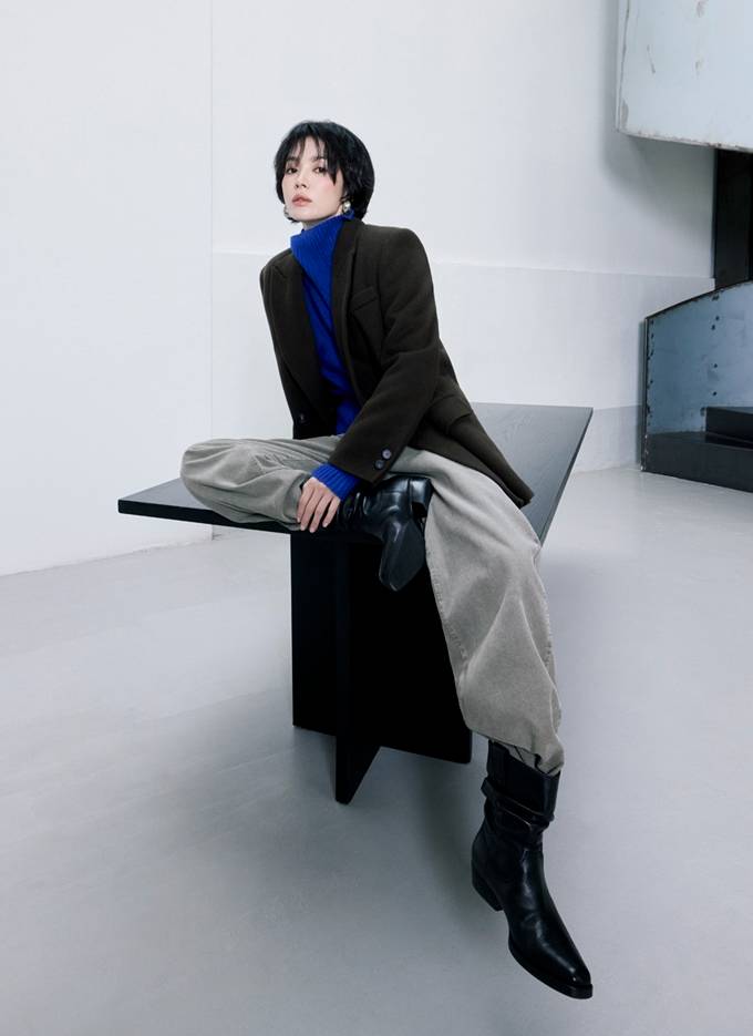 또한, 블루 컬러 니트와 재킷, 큐드로이 팬츠 그리고 입체감이 느껴지는 카디건과 니트 스타일링으로 편안하면서도 시크한 스타일을 연출했다.