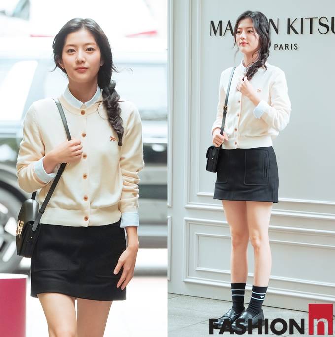 이날 신은수는 아이보리 카디건에 블랙 미니 스커트를 매치한 스타일로 캠퍼스 여신 같은 청순하면서도 러블리한 분위기를 연출했다.
