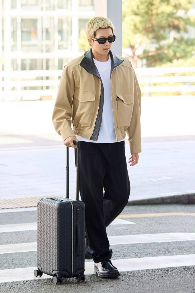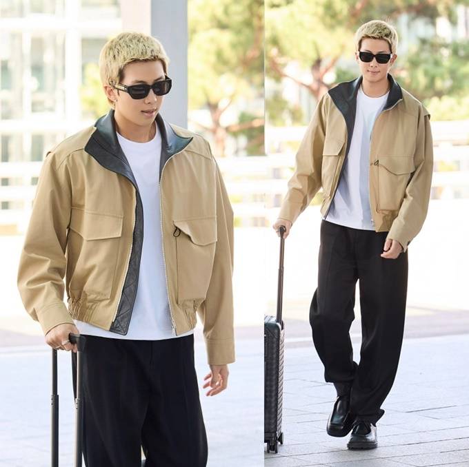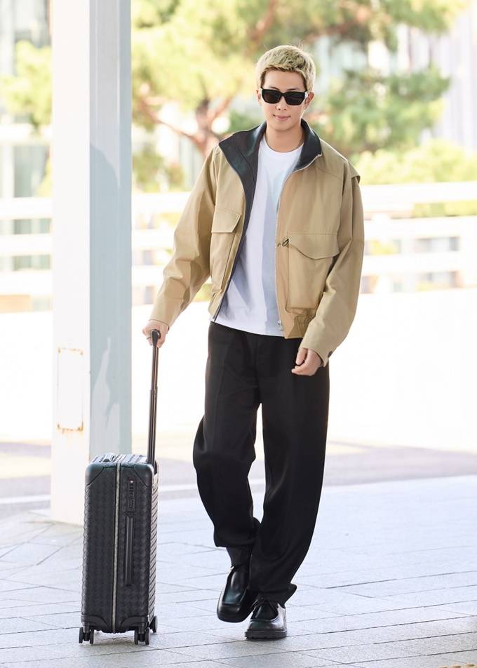 방탄소년단의 리더인 RM(본명 김남준)은 이날 테크니컬 코튼 블루종과 울 팬츠, 여기에 가죽 소재의 벤 레이스업 슈즈를 매치해 편안하면서도 멋스러운 공항 룩을 연출했다.
