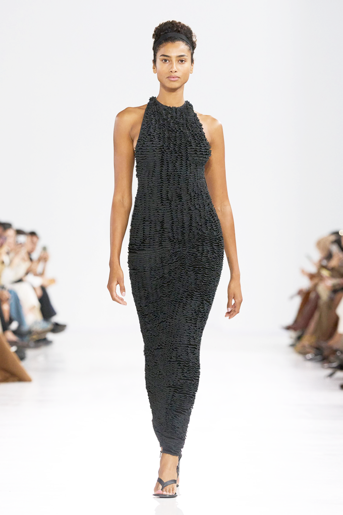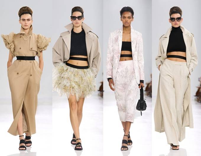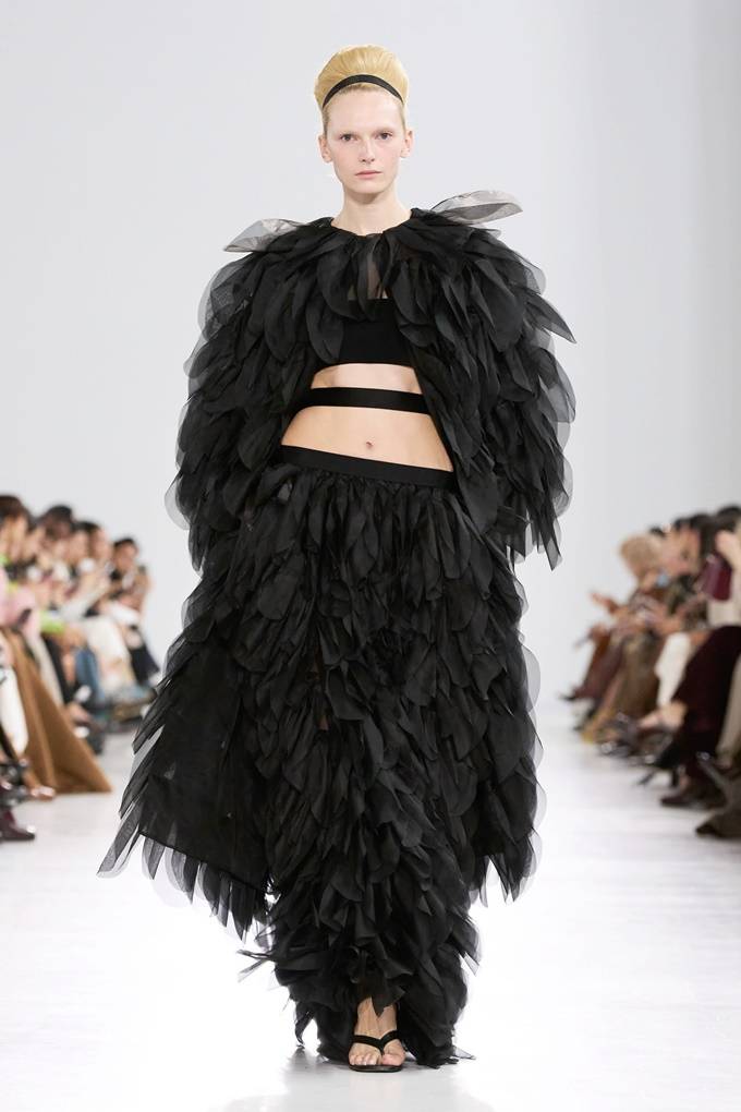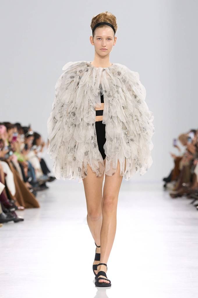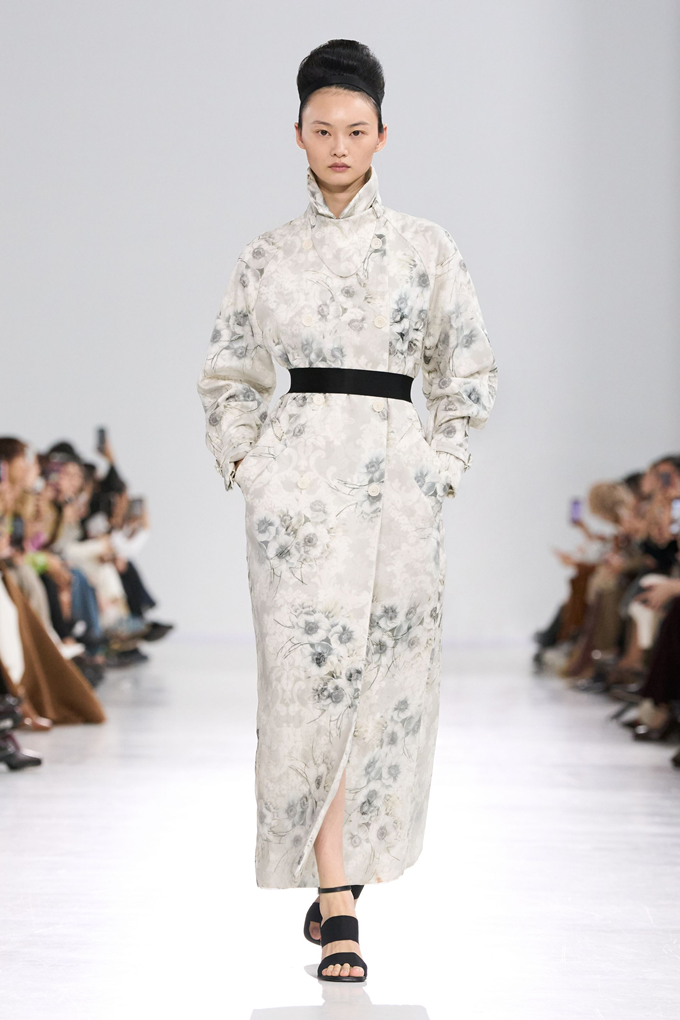 트렌치 코트는 어깨 위에 섬세하게 접힌 왕관 모티브로 장식되어 황금빛 아칸서스 잎(Acanthus leaf)이나 화려한 깃털을 연상시키고, 풍성한 거즈 소재 장식은 펜슬 스커트의 힙 라인을 따라 자연스러운 실루엣을 강조했다.