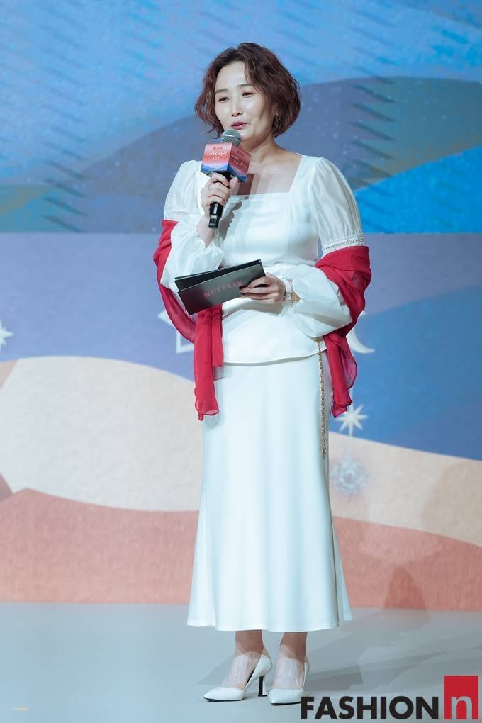 [패션엔 포토] 박경림, 화이트 투피스와 레드 머플러 포인트 여성스러운 MC룩