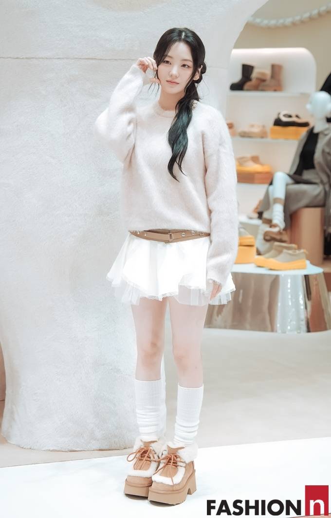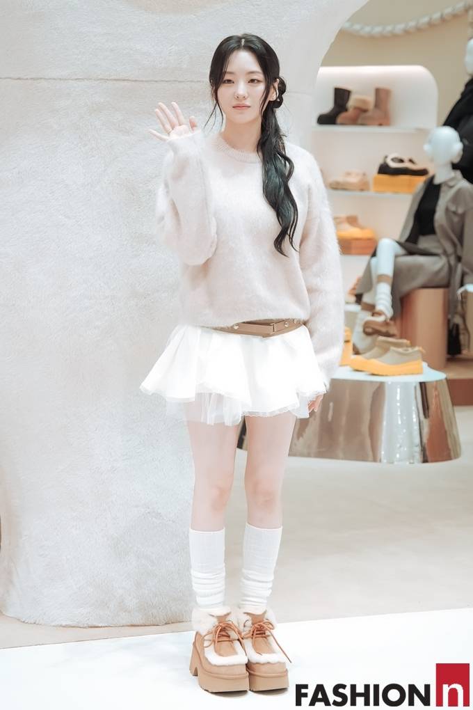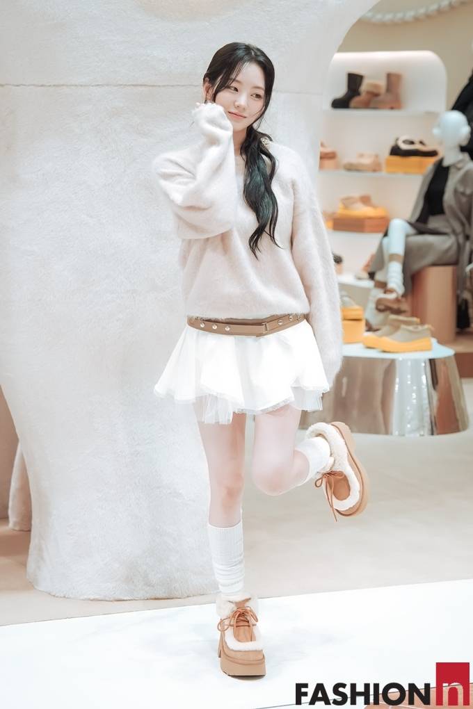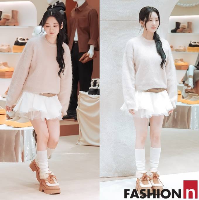 특히 퍼 디테일이 돋보이는 어그 슈즈에 니삭스를 더해, 러블리하면서도 트렌디한 무드를 완성했다.