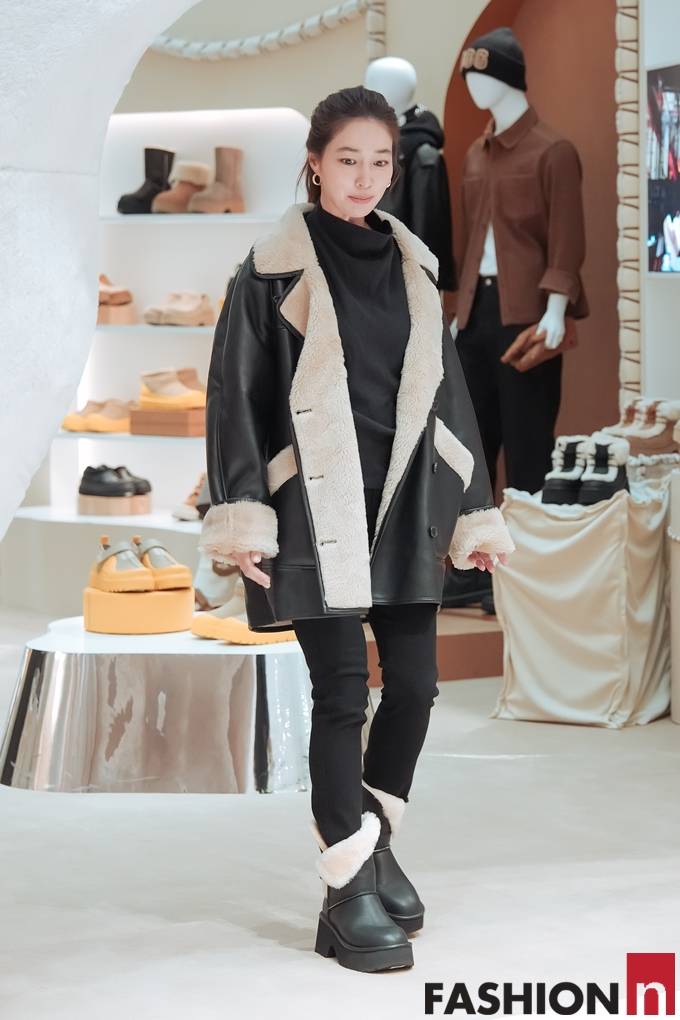 여기에 화이트 퍼 디테일이 돋보이는 어그 부츠를 포인트로 더해, 따뜻하고 트렌디한 나들이룩을 완성했다.