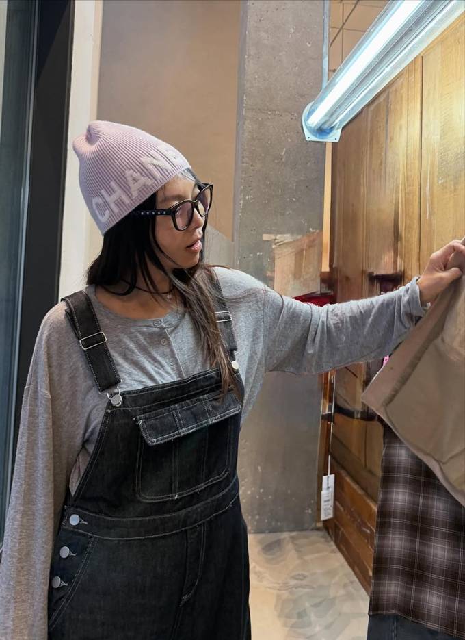여기에 블랙 뿔테 안경과 미니멀한 블랙 토트백에 연핑크 컬러 비니로 포인트를 더하며, 꾸안꾸 감성을 한층 살려냈다.