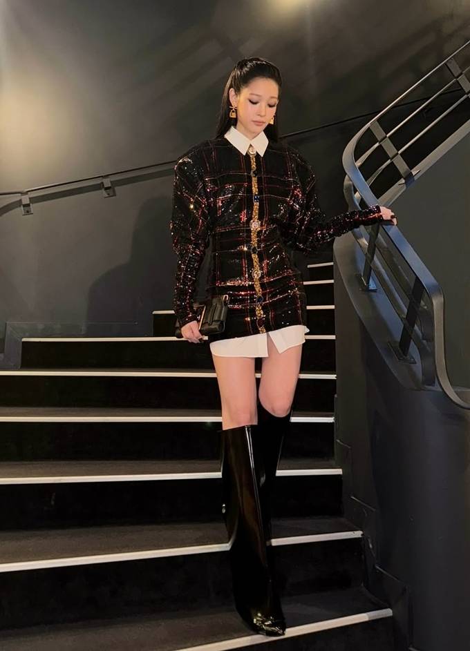 또 여기에 블랙 롱부츠와 골드 버클 장식의 클러치와 구조적인 이어링을 매치해 시크하면서도 럭셔리한 분위기를 더했다.