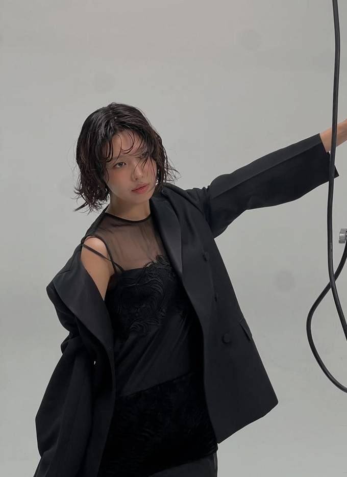 공개한 사진에서 수영은 시스루 블랙 드레스에 오버핏 재킷을 매치해 도회적인 매력을 완성했다.