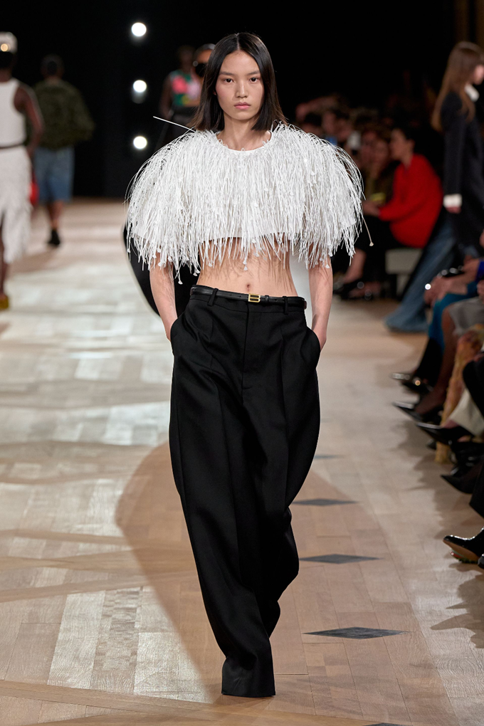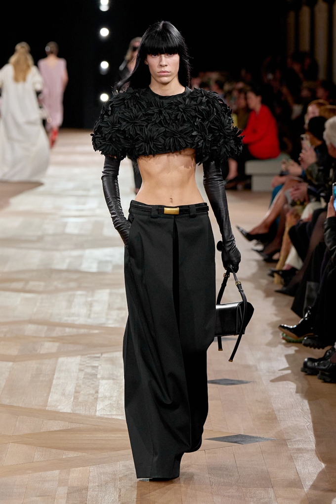 피치올리는 깃털 장식이 돋보이는 하의, 조각 같은 가죽 크롭탑, 프린치 스커트 등 발렌시아가 특유의 건축학적 형태와 기술적 노하우를 선보였다.