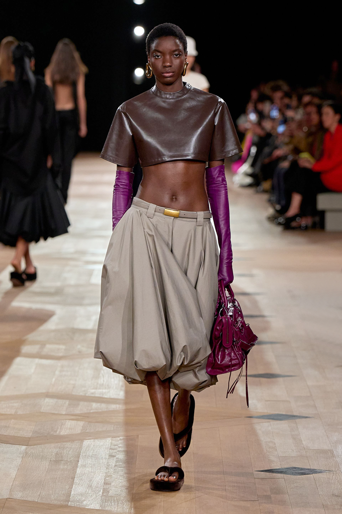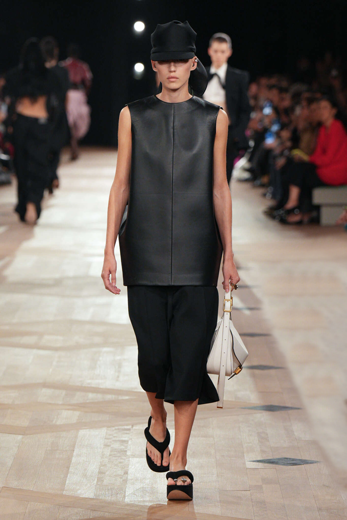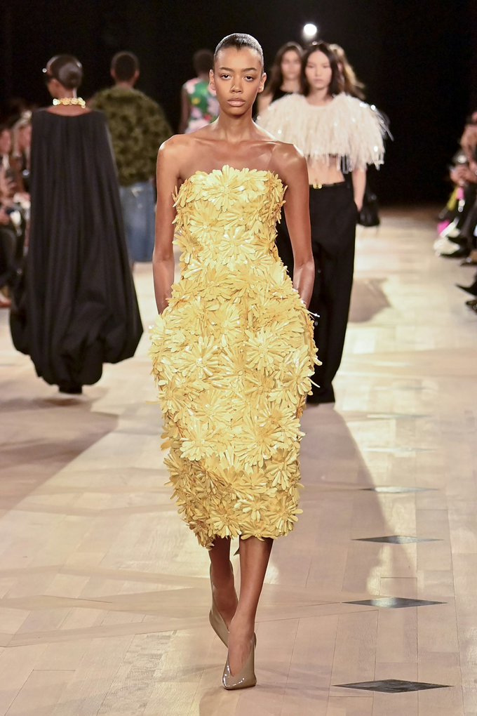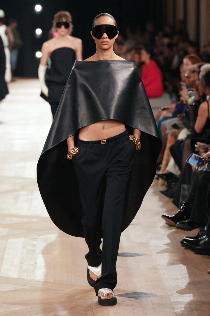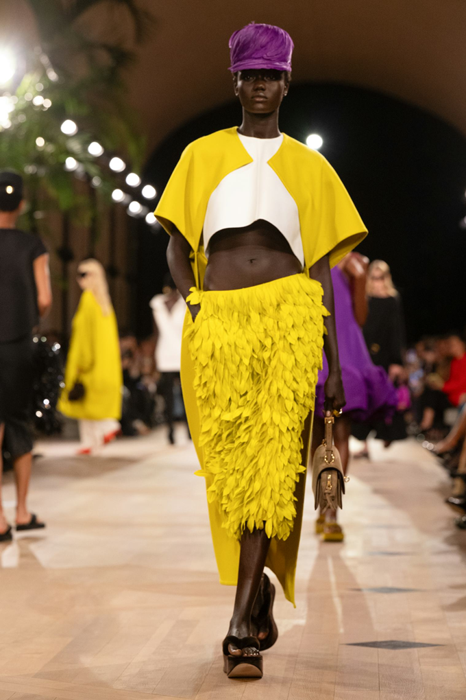피치올리는 깃털 장식이 돋보이는 하의, 조각 같은 가죽 크롭탑, 프린치 스커트 등 발렌시아가 특유의 건축학적 형태와 기술적 노하우를 선보였다.