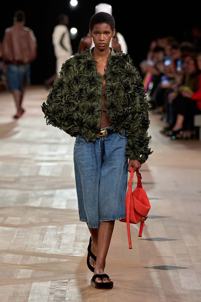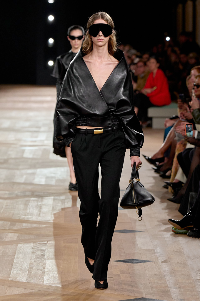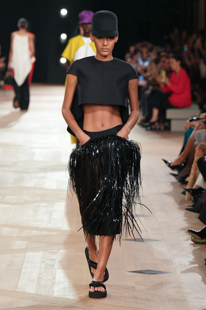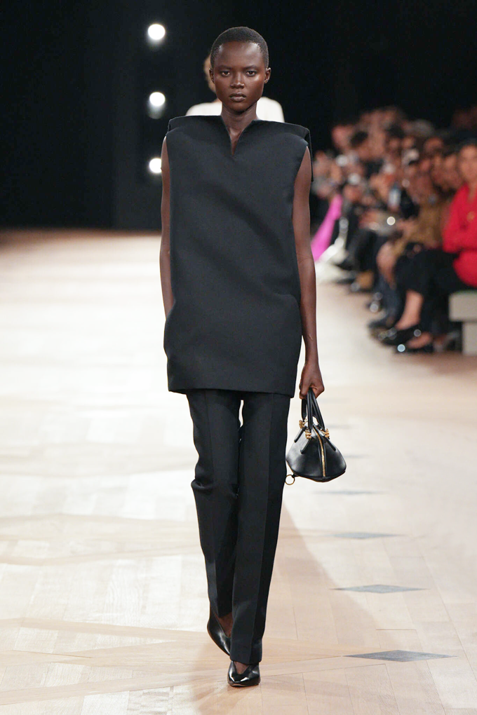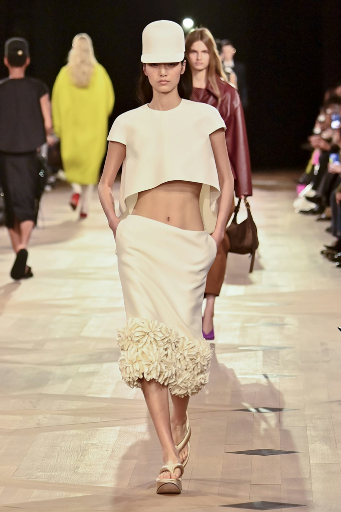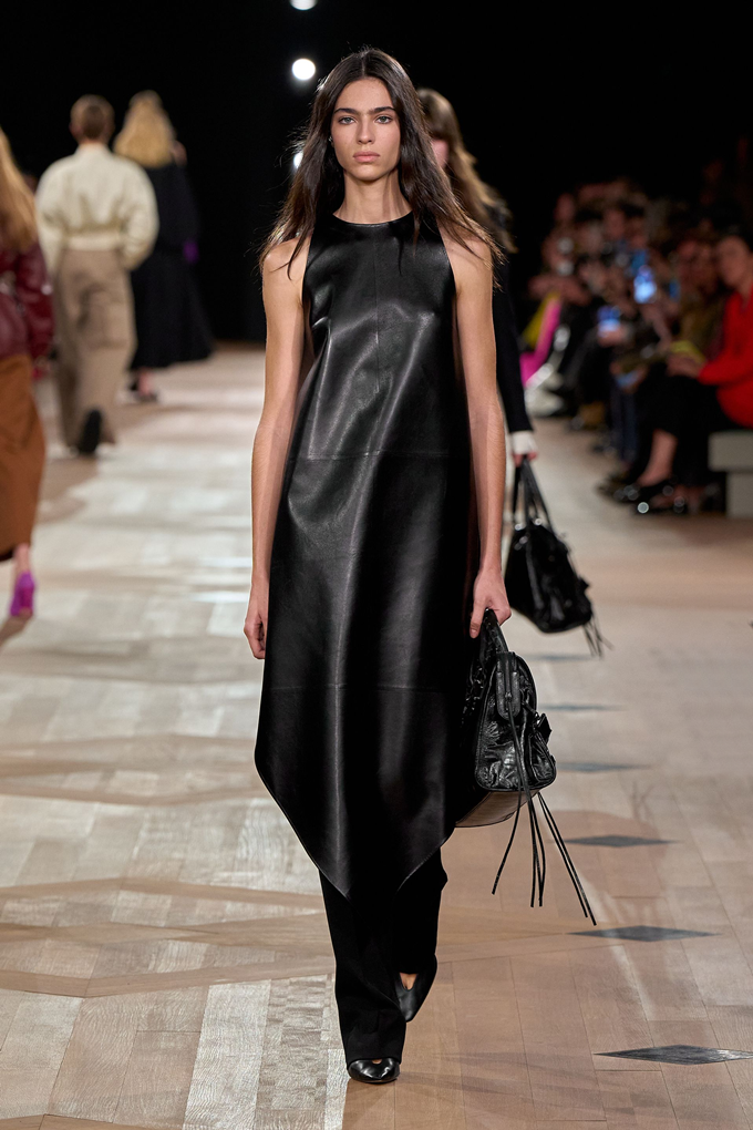 피치올리는 깃털 장식이 돋보이는 하의, 조각 같은 가죽 크롭탑, 프린치 스커트 등 발렌시아가 특유의 건축학적 형태와 기술적 노하우를 선보였다.