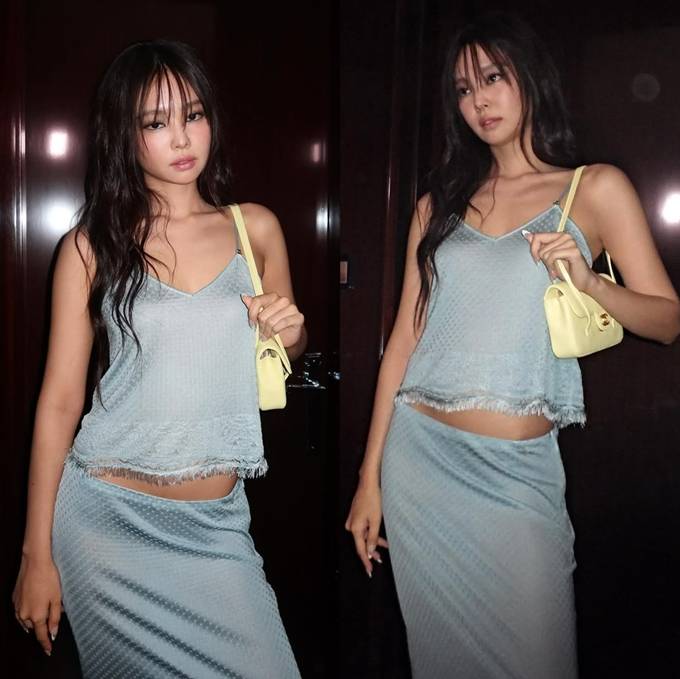 공개한 사진과 영상에서 제니는 은은한 블루 컬러의 슬립 탑과 스커트 셋업으로 등장, 관능미와 청순미를 동시에 발산했다.