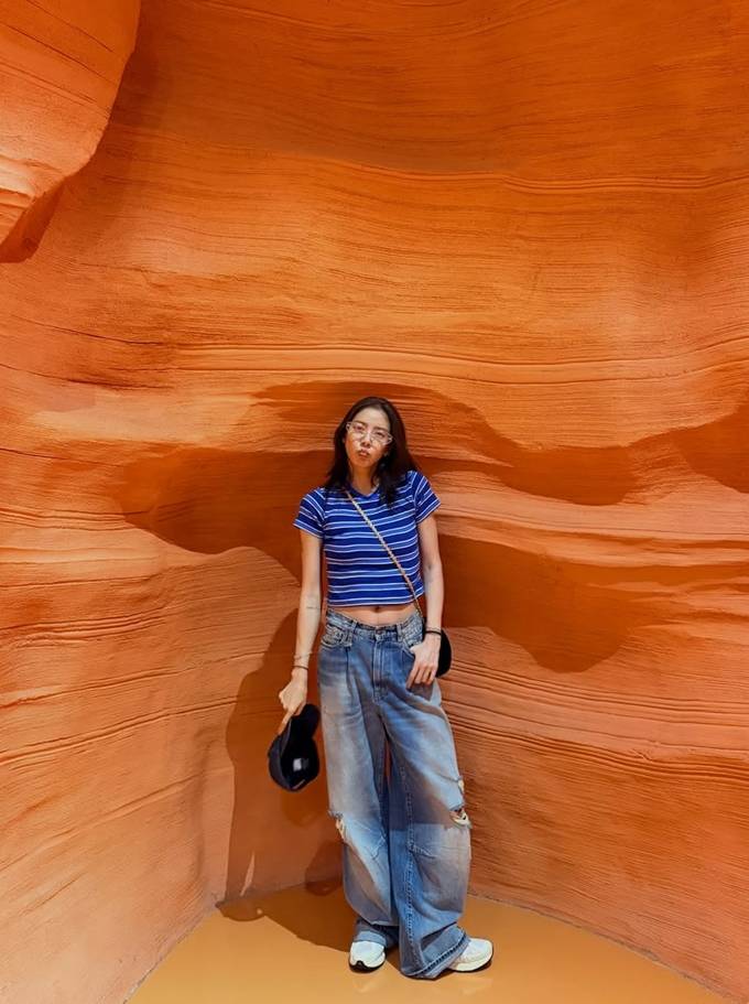 여기에 스니커즈와 미니 크로스백으로 포인트를 더해 실용적이면서도 감각적인 스타일을 보여줬다.
