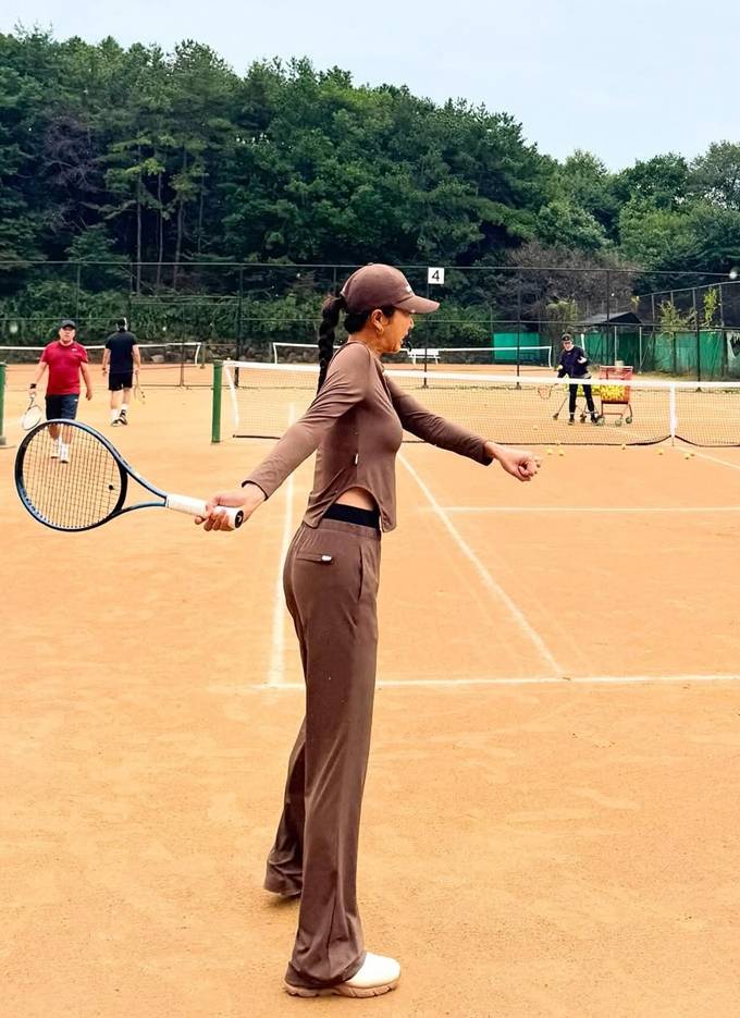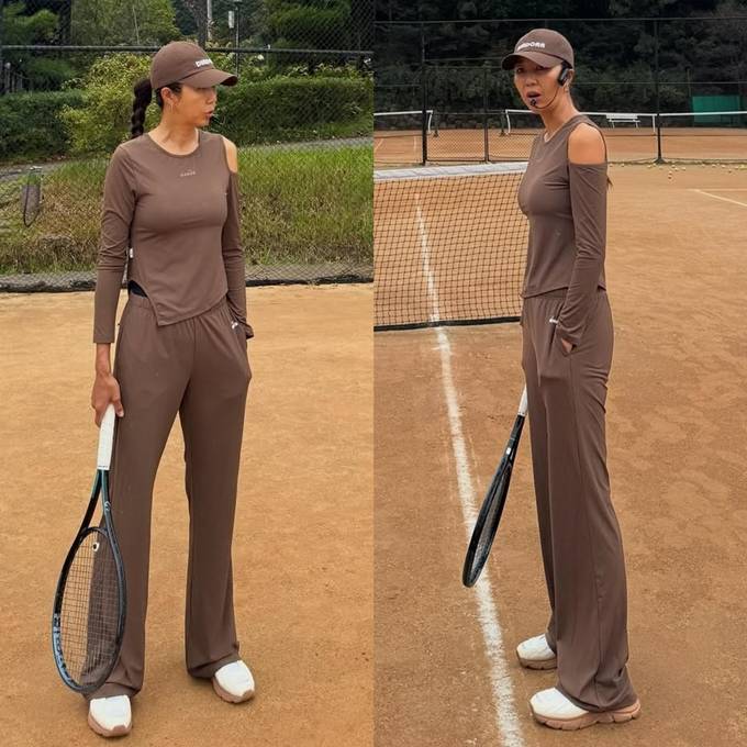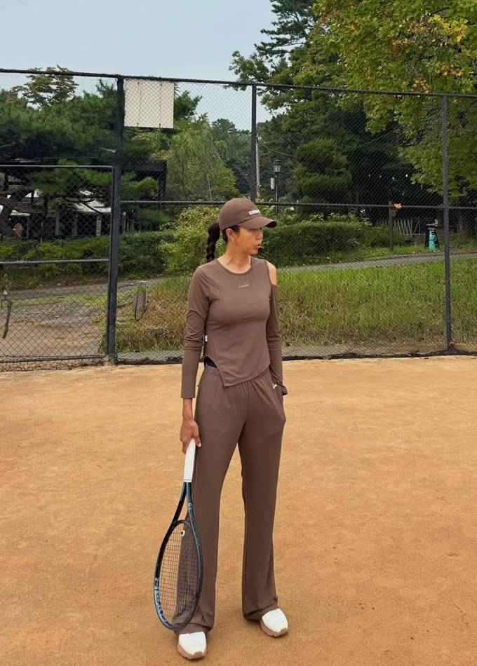 공개한 사진에서 전미라는 브라운 톤의 숄더 컷아웃 상의와 와이드 팬츠를 매치한 톤온톤 스타일로 일상복 같은 스타일리시한 테니스룩을 선보였다.