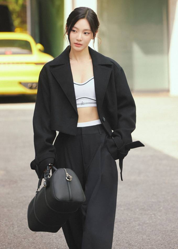 닝닝은 크롭 재킷에 브라톱을 매치해 세련된 애슬레저 무드를 완성했다. 넓은 카라 디테일의 블랙 재킷은 과감한 실루엣으로 도시적인 분위기를 자아내며, 여기에 하이웨이스트 와이드 팬츠로 시크한 비율미를 강조했다.