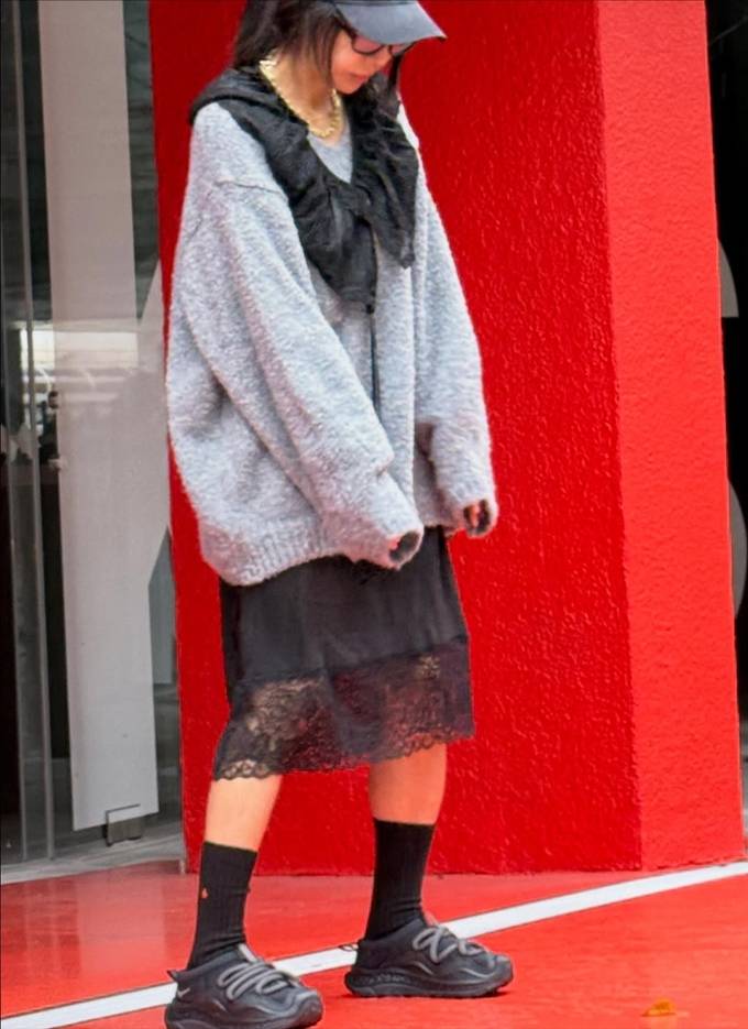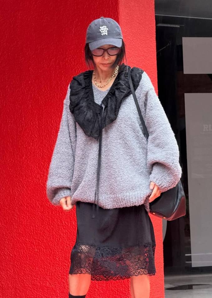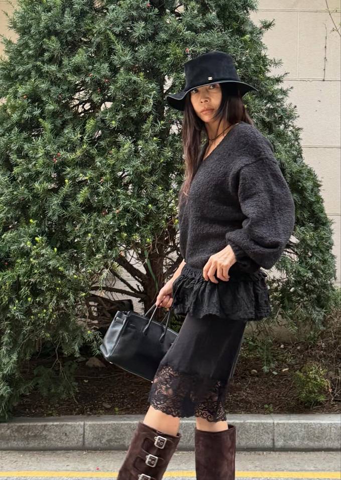 배우 황신혜가 레이스 스커트에 루즈핏 니트의 올 블랙룩으로 멋스러운 가을 스타일을 연출했다.