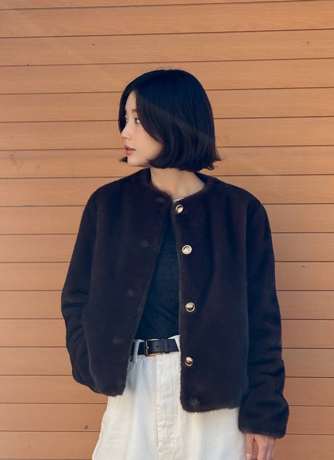 기은세는 클래식한 분위기의 금장 버튼 디테일이 눈에 띄는 짙은 브라운 컬러의 퍼 재킷으로 따뜻하면서도 우아한 분위기를 자아냈다.