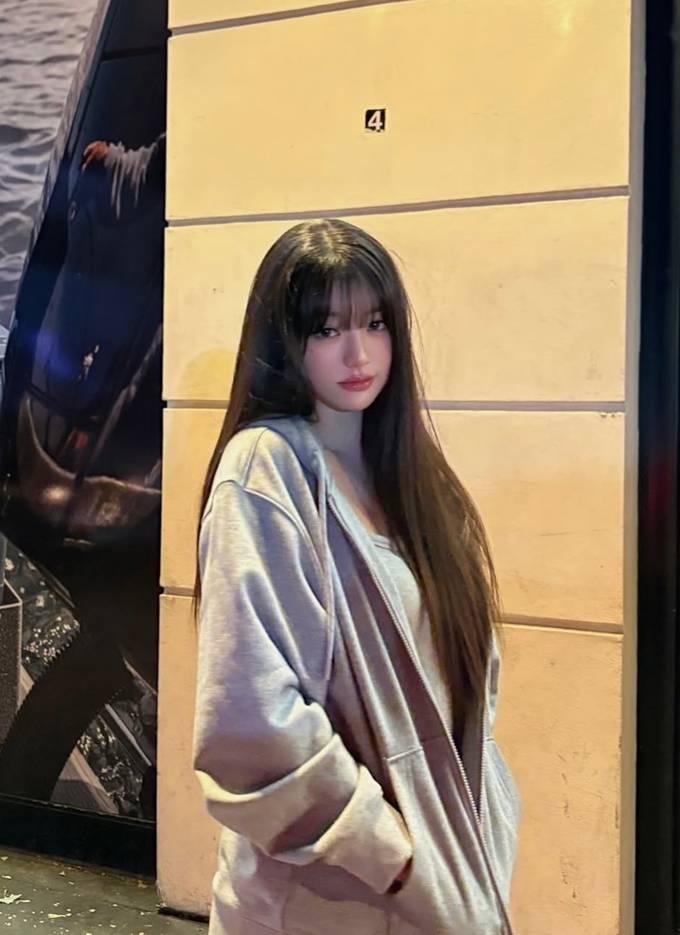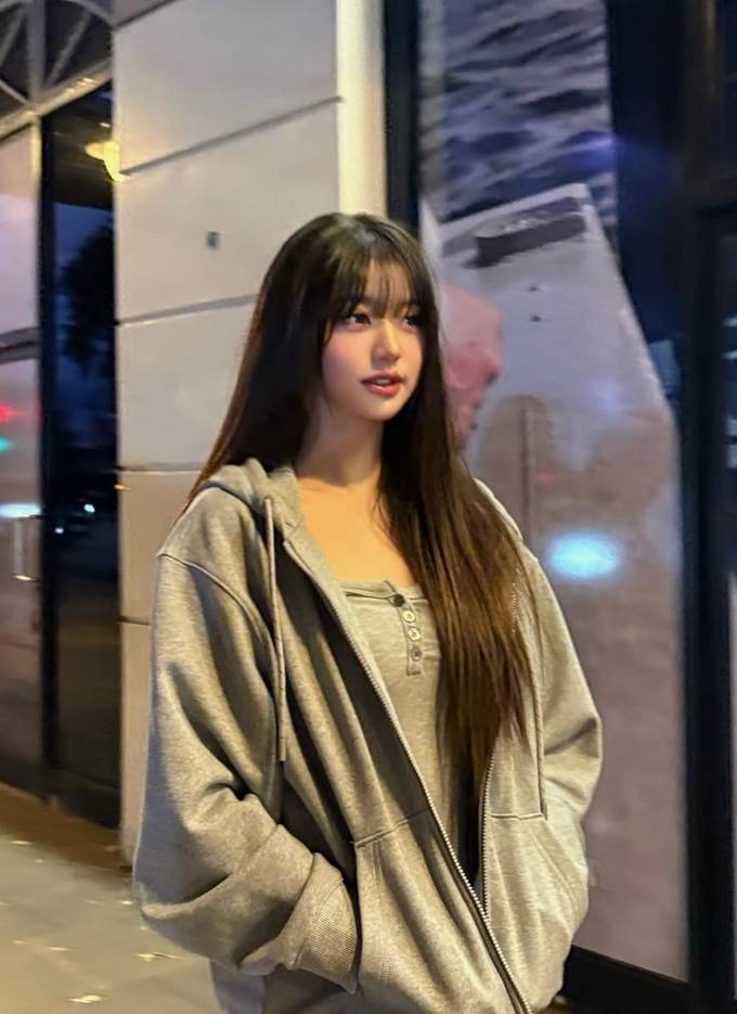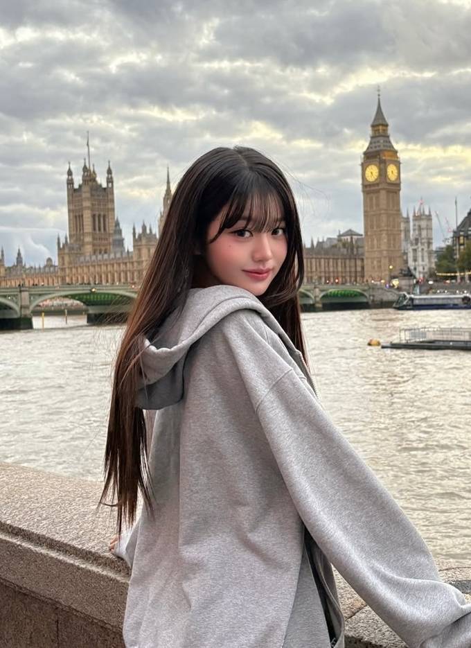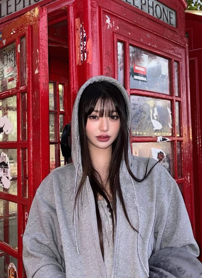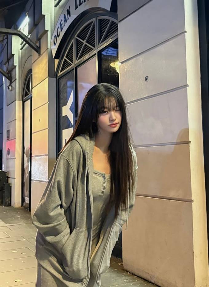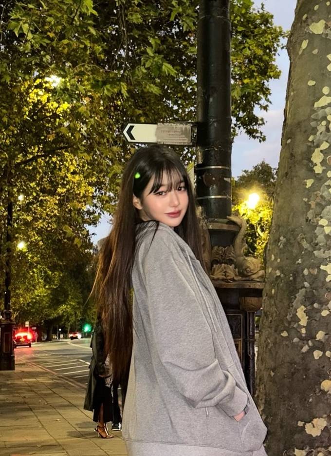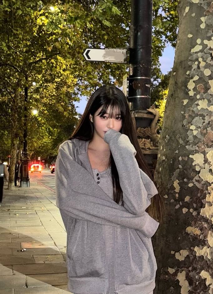 그룹 아이브의 장원영이 런던에서 오버핏 후드 집업 스웻셔츠로 자유로운 휴식 타임을 즐겼다.