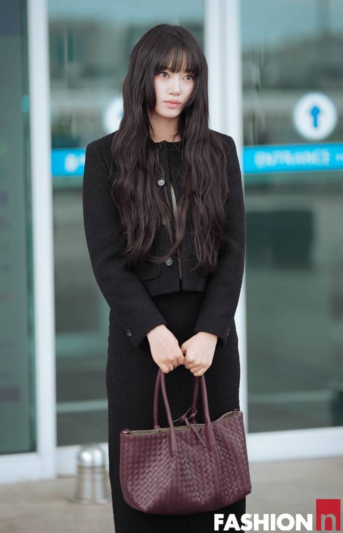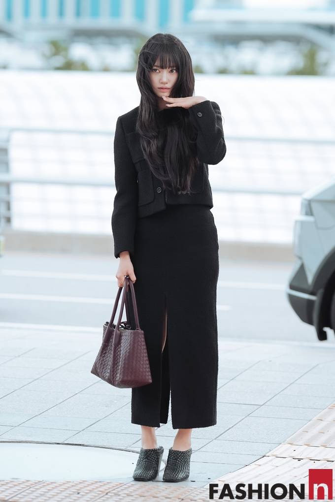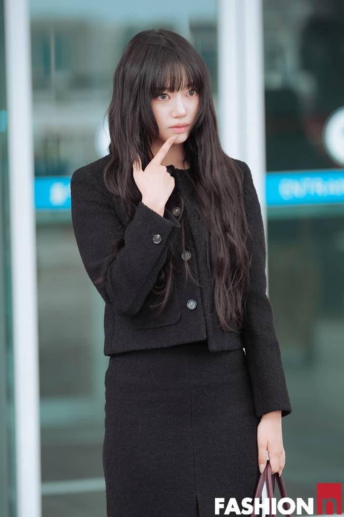 [패션엔 포토] 미야오 수인, 공항이 발칵! 단정함 속 은근 섹시미 올 블랙 앞트임 투피스룩