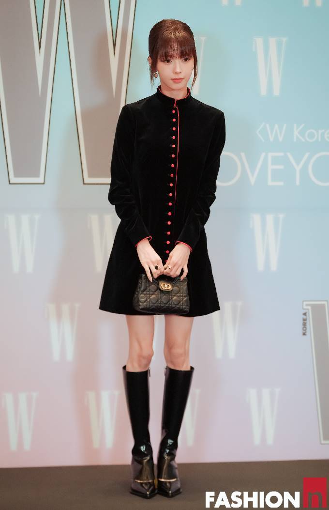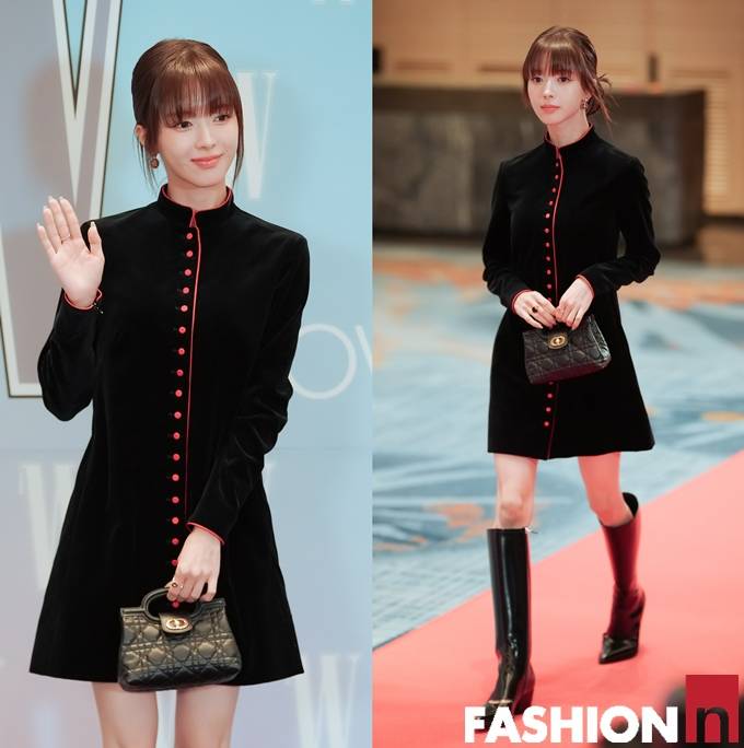 이날 행사에서 노정의는 레드 버튼 디테일이 더해진 블랙 벨벳 소재의 하이넥 미니 드레스룩으로 독보적인 인형 미모를 뽐냈다.