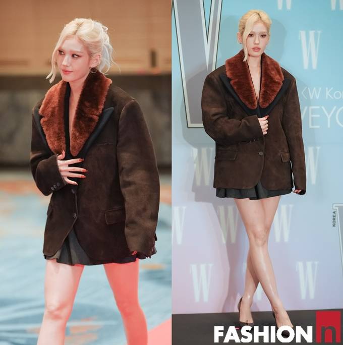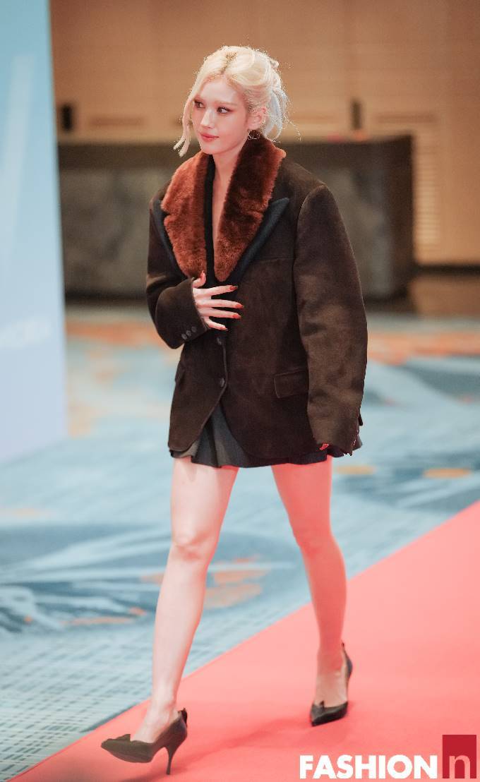 이날 전소미는 짧은 미니 하의에 브라운 컬러의 퍼 카라 재킷의 하의실종룩으로 특유의 당당하고 자신감 넘치는 스타일을 완성했다.