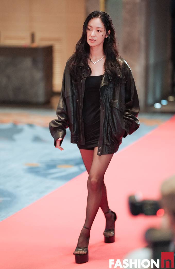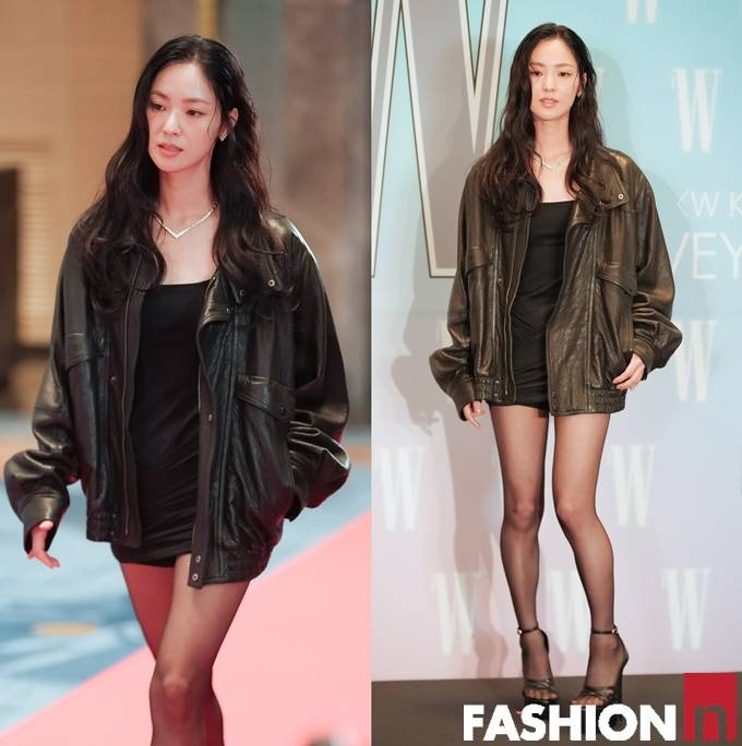 이날 전여빈은 블랙 미니 원피스에 오버핏 레더 재킷을 매치한 하의실종룩으로 도회적인 시크미를 뽐냈다.
