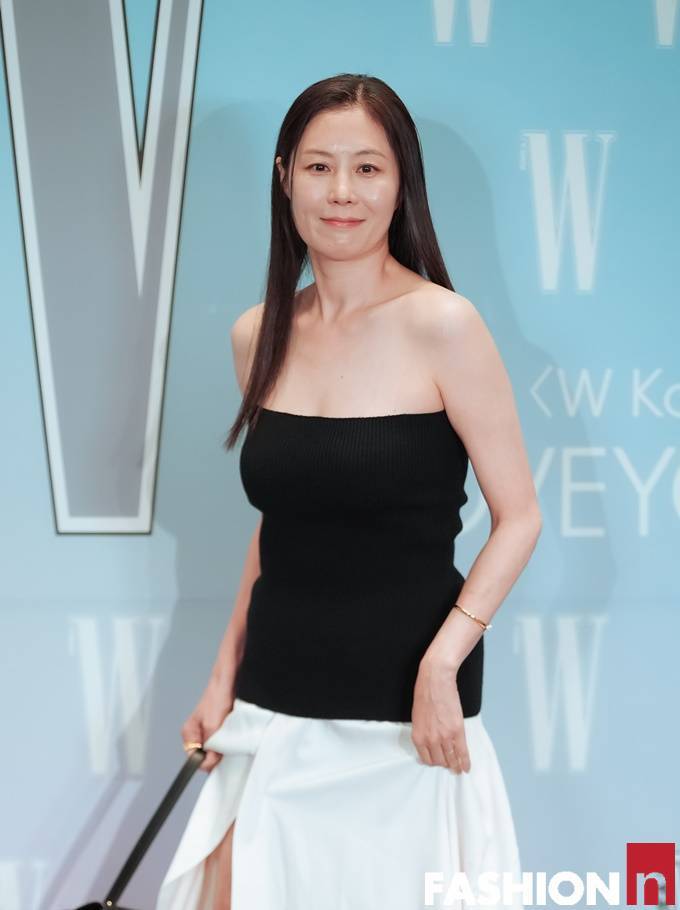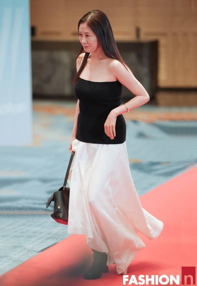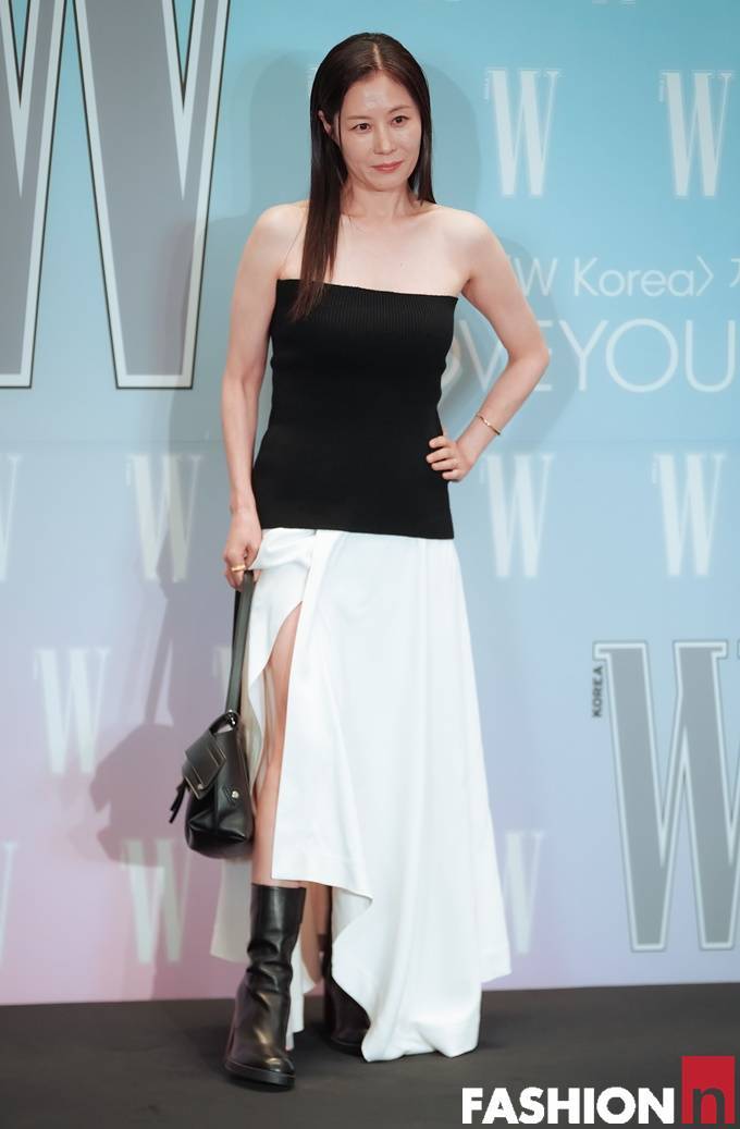 배우 문소리가 대담한 블랙 오프숄더 티셔츠와 화이트 하이슬릿 스커트를 매치한 파격적인 블랙앤화이트룩으로 시크한 자태를 뽐냈다.