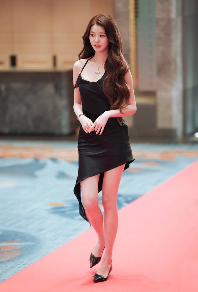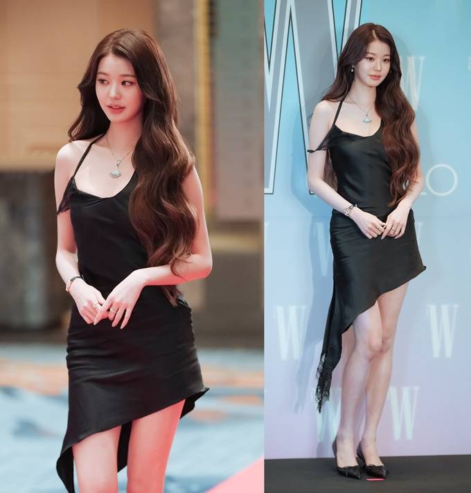 이날 장원영은 비대칭 비율의 하늘하늘한 블랙 슬립 드레스룩으로 섹시한 자태를 뽐냈다.