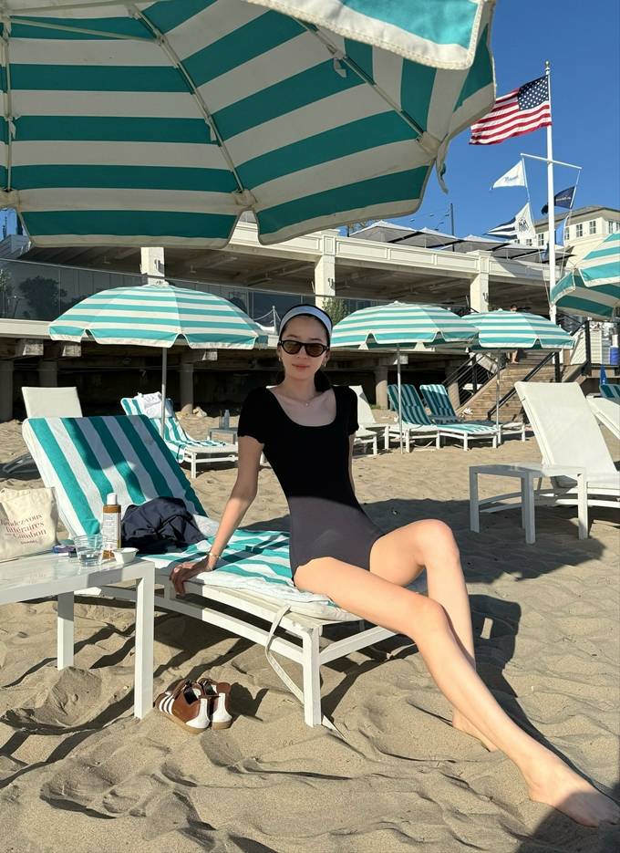 특히 등이 시원하게 파인 백라인 디자인이 뒷모습까지 시선을 사로잡으며, 자연스러운 리조트 무드를 더했다.