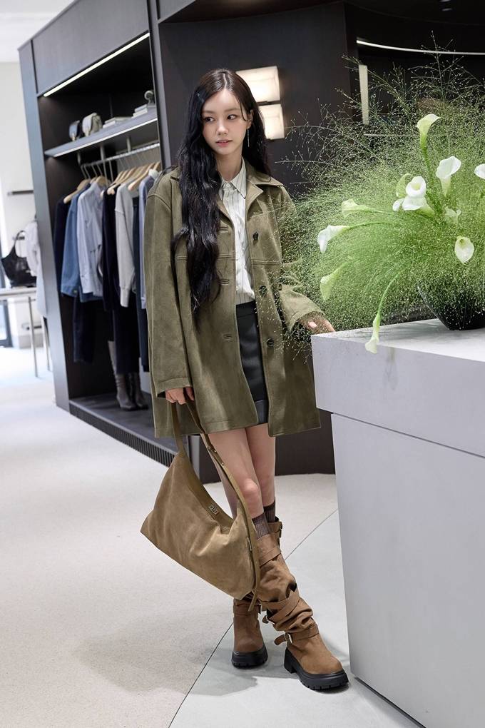 이날 혜리는 은은한 카키 브라운 컬러의 하프기장 스웨이드 재킷으로 세련된 모카무스 가을룩을 연출했고, 여기에 고급스러운 골드카키 스웨이드백을 매치해 우아한 가을 스타일을 선보였다.