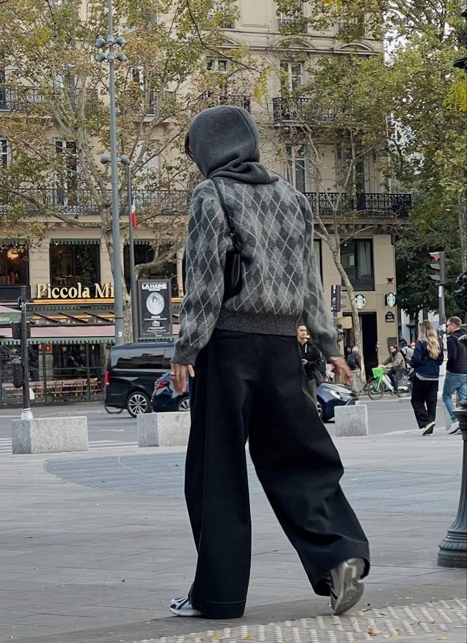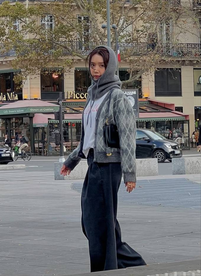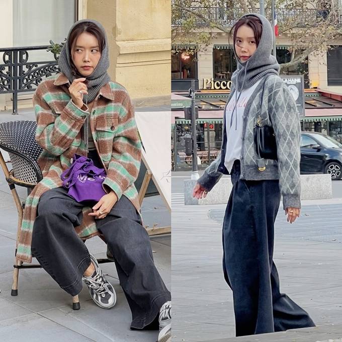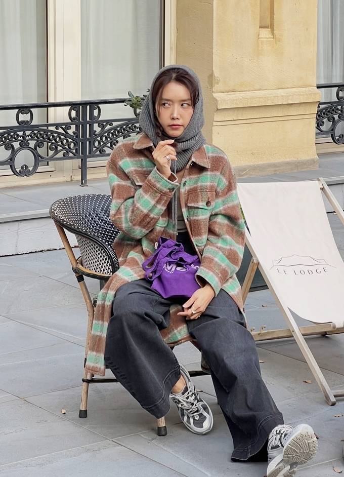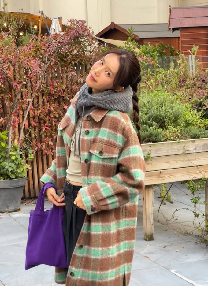 체크 패턴의 롱 코트와 와이드 팬츠, 그리고 빈티지한 그레이 카디건을 매치해 파리지앵 감성을 제대로 살렸다. 여기에 퍼플 백으로 포인트를 더해, 차분한 룩 속에서도 존재감을 확실히 드러냈다.