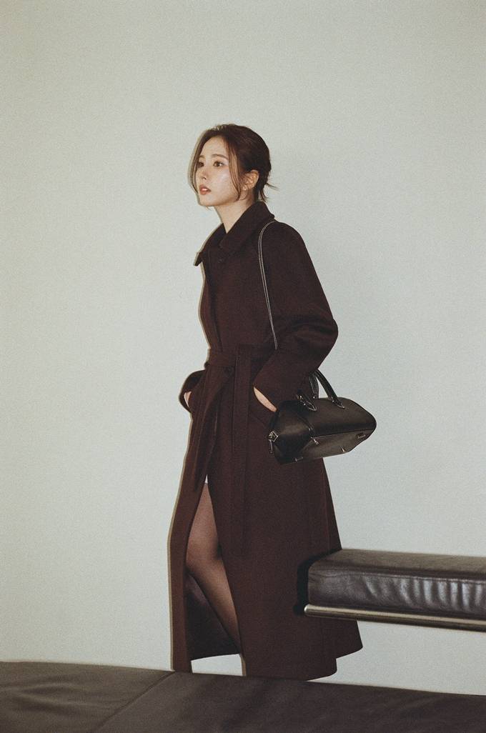 또 클래식한 카멜 컬러의 롱 코트로 고급스러운 분위기를 연출했다. 루즈한 실루엣에 벨트로 포인트를 더해 여리여리한 라인을 강조했으며, 브라운 미니백을 매치해 세련된 출근룩으로도 손색없는 스타일을 완성했다.