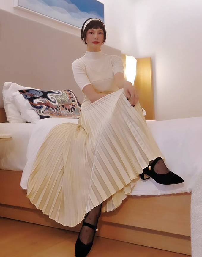 송경아는 아이보리 톤의 하이넥 니트와 플리츠 롱 스커트를 매치해 단아하면서도 고급스러운 무드를 선보였다. 자연스럽게 떨어지는 주름 디테일이 다리를 더욱 길어 보이게 하며, 모델다운 실루엣을 극대화했다.