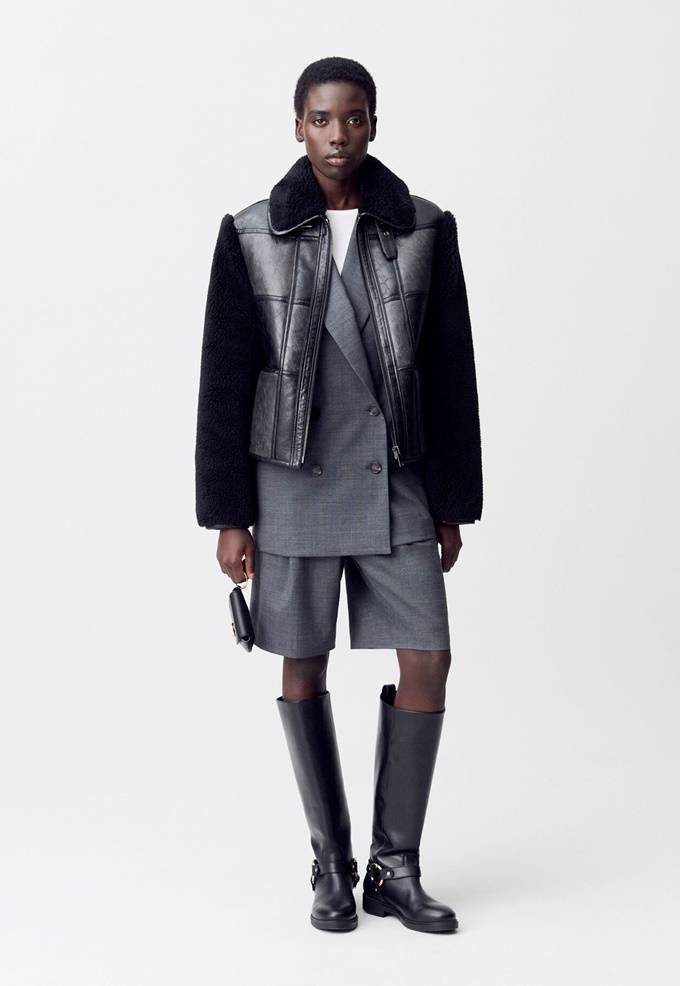 프렌치 컨템포러리 브랜드 '끌로디 피에로(CLAUDIE PIERLOT)' 페이크 퍼 레더 재킷은 소매와 사이드에 퍼 소재를 믹스하여 입체적인 텍스처를 강조한 아이템으로 펑키한 분위기를 연출한다.