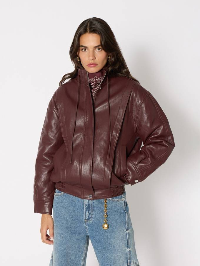프렌치 컨템포러리 브랜드 '베르니스(BERENICE)'의 버건디 컬러 페이크 레더 재킷은 넥 라인의 스트링으로 실루엣을 조절할 수 있으며 톤온톤 스티치 디테일로 깔끔함을 더했다.