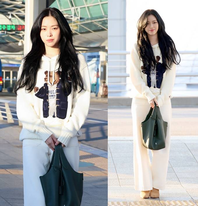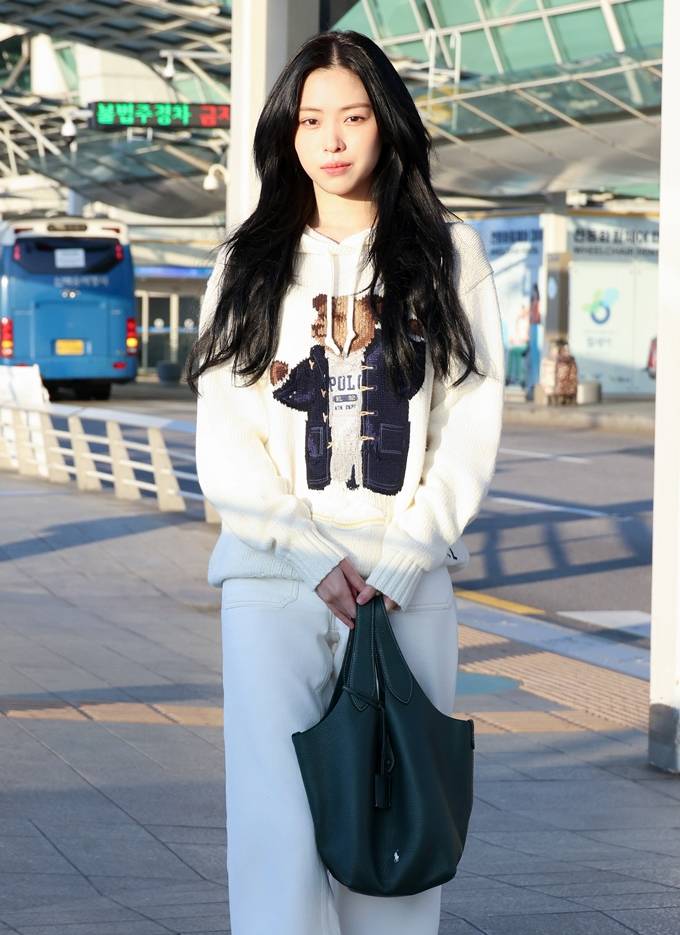 류진은 빈티지 스타일의 폴로 베어 디테일이 돋보이는 코튼 리넨 니트 후디와 깔끔한 화이트 컬러의 와이드 레그 치노 팬츠를 착용해 캐주얼하면서도 편안한 공항패션을 선보였다.