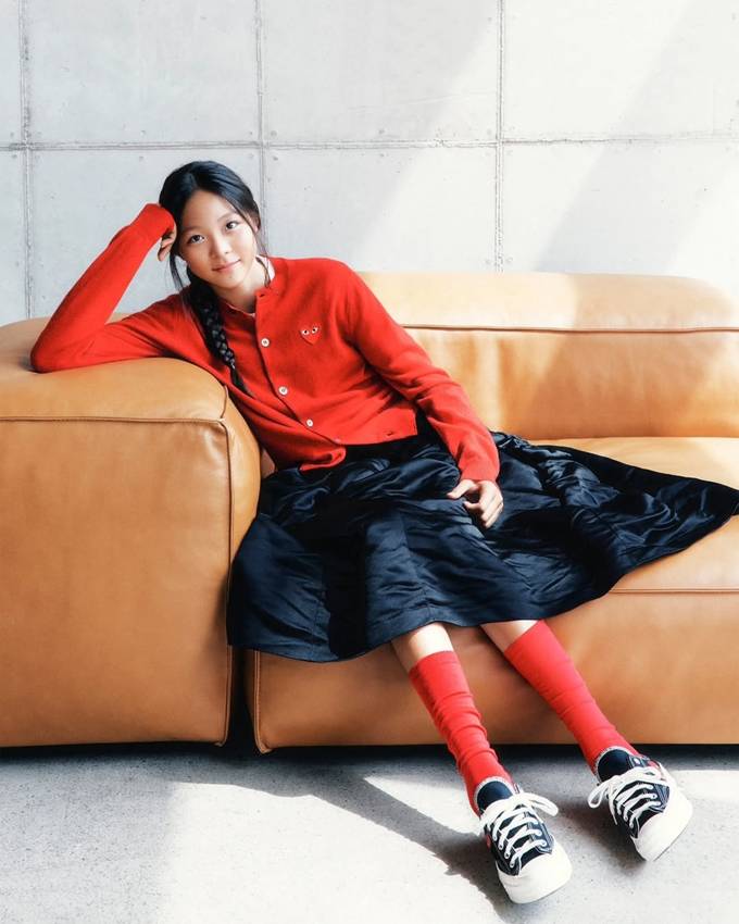 공개한 사진에서 추사랑은 강렬한 레드 컬러의 카디건과 블랙 스커트를 매치한 상큼하면서도 발랄한 무드를 완성했다. 여기에 이너로 스트라이프 티셔츠를 레이어드해 발랄한 포인트를 주었다.