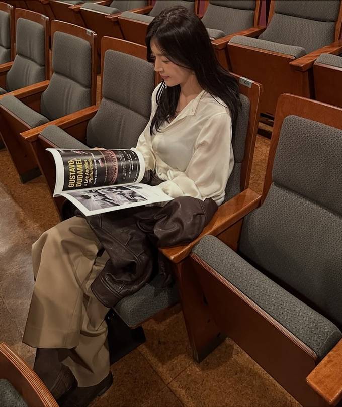 여기에 한지혜는 미니멀한 블랙 백과 가죽 재킷을 더해 클래식 공연장에 어울리는 시크한 감성을 완성했다.