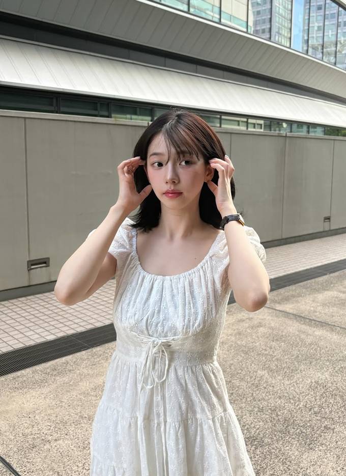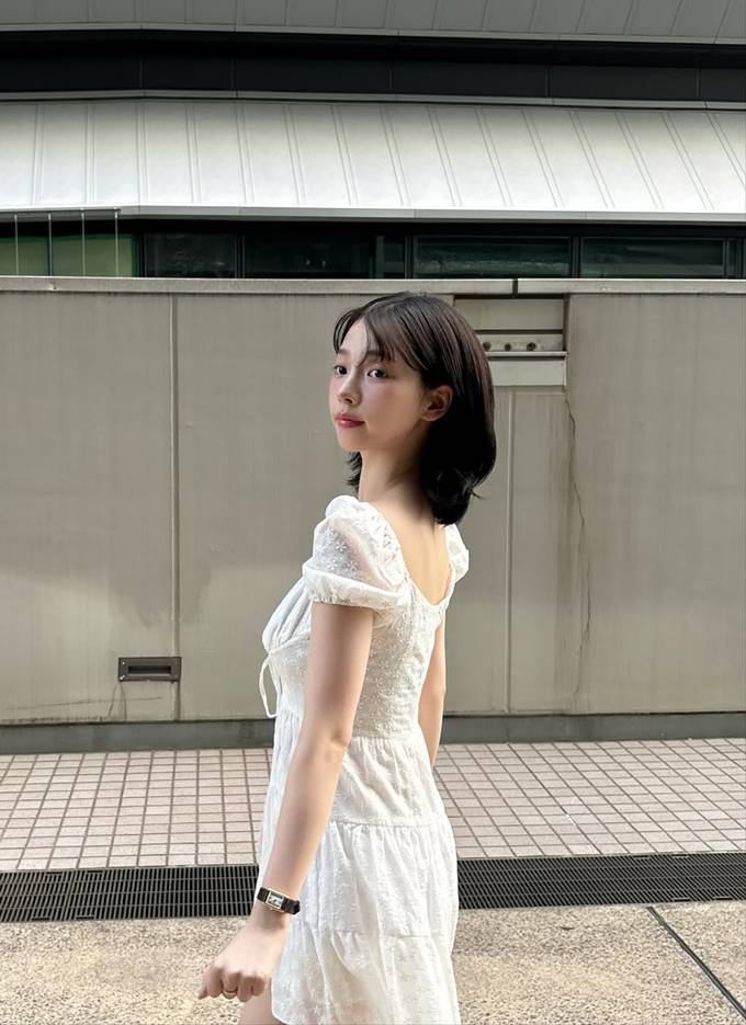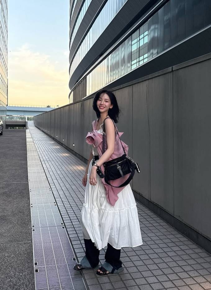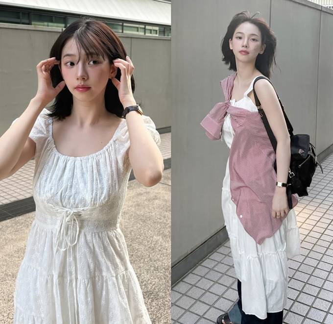 특히 스모크 밴딩 디테일이 허리를 슬림하게 잡아주며, 자연스럽게 퍼지는 실루엣이 로맨틱한 분위기를 연출했다.