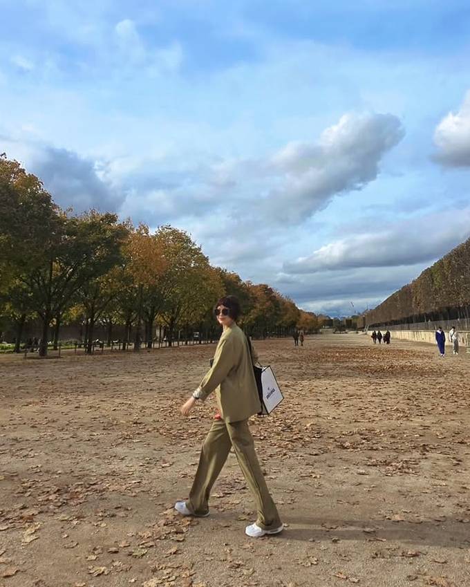 여기에 블랙 선글라스와 화이트 스니커즈로 편안하면서도 쿨한 무드를 더했고, 내추럴한 웨이브 단발과 미소는 여유로운 파리지앵의 감성을 완성했다.