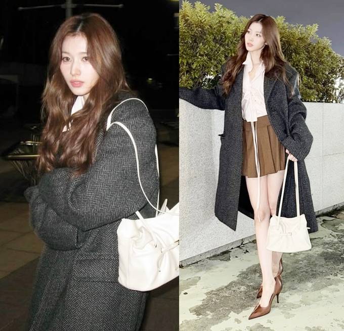 이너로는 연핑크 리본 블라우스에 브라운 미니 스커트를 매치해 로맨틱한 무드를 더했고, 여기에 크림색 숄더백과 브라운 힐로 포인트를 줘 고급스러움을 더했다.