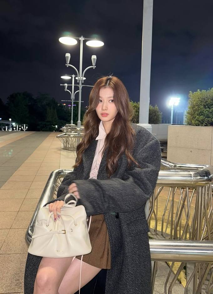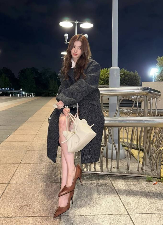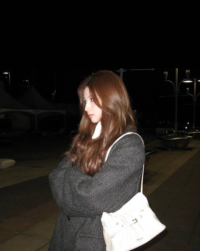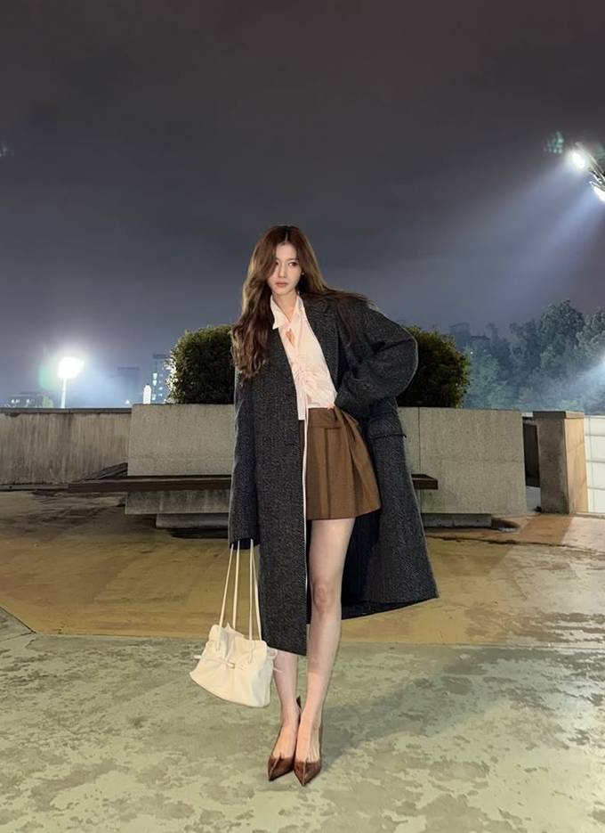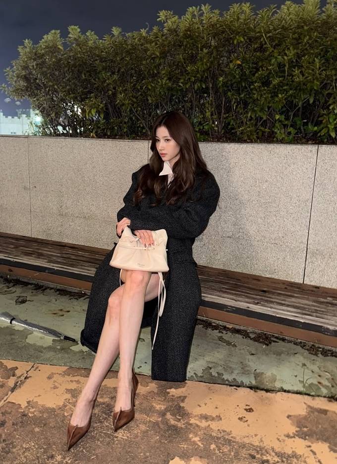 공개한 사진에서 사나는 헤링본 덱스처의 묵직한 그레이 컬러의 롱 코트를 걸치고 따뜻하면서도 세련된 밤 외출룩의 정석을 선보였다.