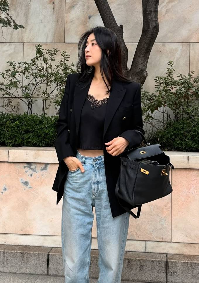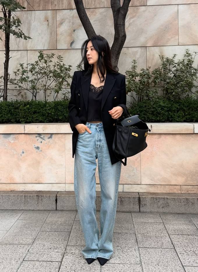 공개한 사진에서 한지혜는 골드 버튼이 돋보이는 블랙 더블 재킷에 레이스 포인트 슬리브리스 톱과 라이트 워시 데님 팬츠를 매치해 시크하면서도 페미닌한 무드를 연출했다.