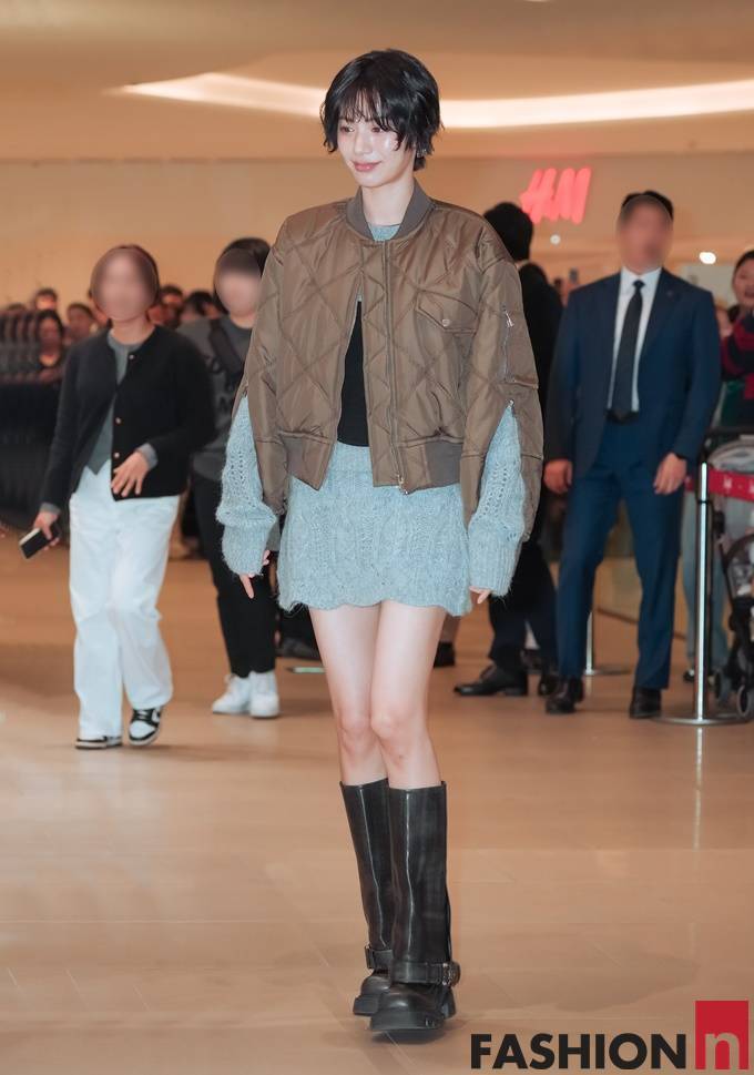 이날 나나는 케이트 니트 투피스와 경량 퀼팅 봄버을 레이어드한 러블리한 윈터룩으로 9등신 바율의 눈부신 각선미를 뽐냈다.